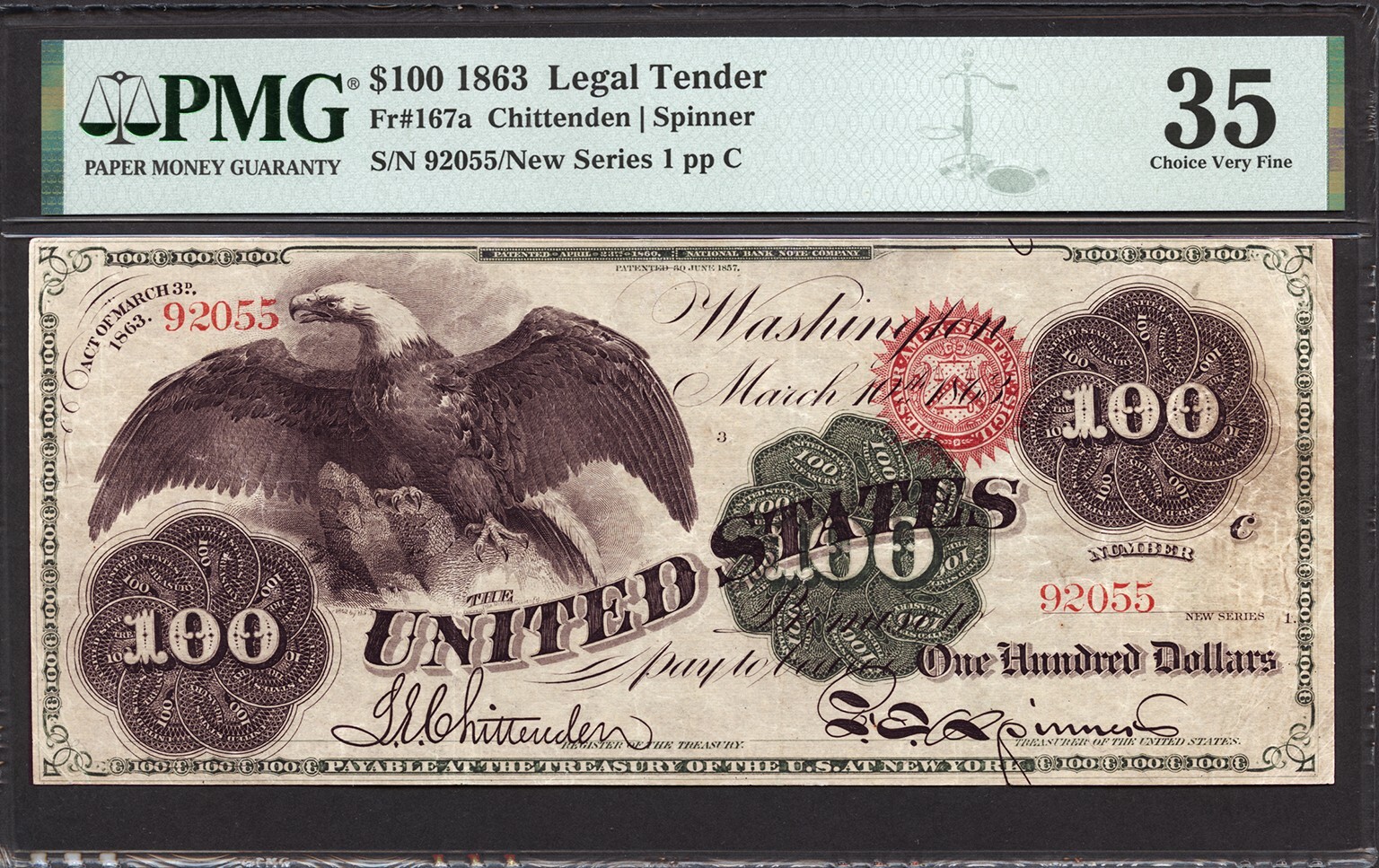 FR 167a $100 1863 Legal Tender PMG 35 - This “Spread Eagle” note possesses one of the most iconic and dramatic depictions of our national bird found on U.S. paper money. Issued as the Series of 1862 and 1863, this Civil War note is one of the first $100 bills issued for general circulation. This classic design has long been regarded as one of the great numismatic rarities and as such has been an object of desire for most collectors of United States paper money. According to the census, there are only 22 examples known for this Friedberg number with 5 permanently impounded in museums. With several $100 Spread Eagles in Fine condition or worse, one would be hard pressed to find a Spread Eagle that faces up better than this near perfect example. With exceptional eye appeal, color and a remarkably bold Eagle for the grade, it is a small miracle that such early piece of United States paper money has retained much of its original glory and splendor. As a matter of fact, PMG was so enthralled by this example, this note lacks what so many other Spread Eagle notes possess…negative comments from the grading service (such as restoration, pinholes, repairs, etc).