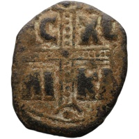 Obverse: Three-quarter length figure of Christ Antiphonetes standing facing, wearing nimbus cruciger, pallium and colobium and raising right hand in benediction, book of gospels in left hand.