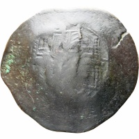 Reverse: Full-length figure of emperor, bearded wearing stemma, divitision, collar-piece, jeweled loros of simplified type and sagion, holding cross in right hand.