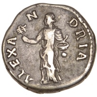 Reverse: Alexandria standing left, holding sistrum and snake in basket
