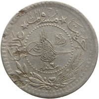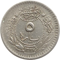 Reverse legend: دولة عثمانية ضرب في ☆ - ☆ قسطنطينية ٥ پاره ١٣٢٧