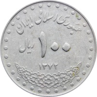 Reverse legend: “جمهوری اسلامی ايران ١٠٠ ریال ۱۳۷۳”