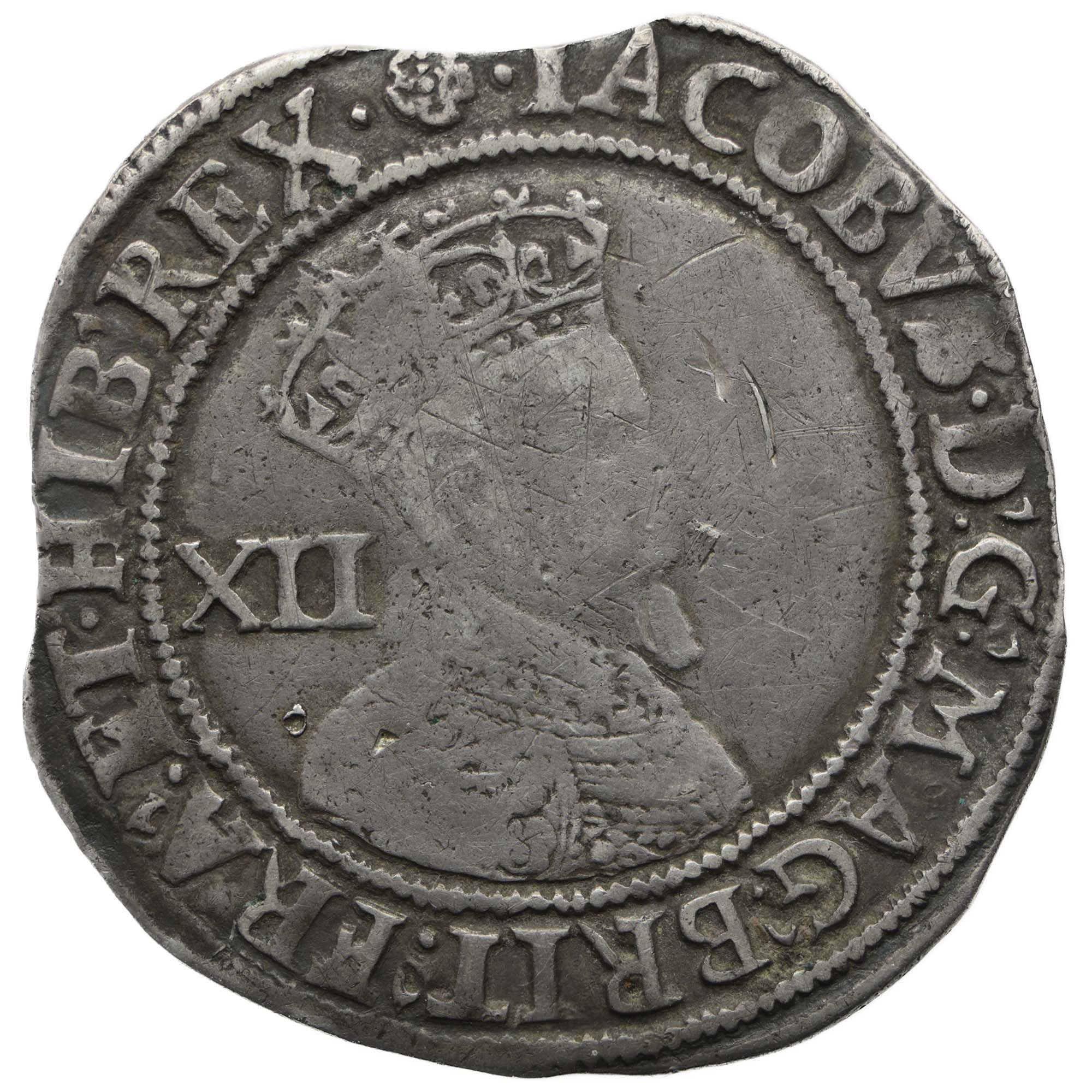 Obverse: Crowned portrait facing right with square beard that stands out. Lettering XII behind head. Beaded circle around, lettering surrounding