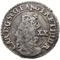 Obverse: Left facing bust of Charles I, mark of value to the right