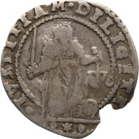 Obverse: Doge kneeling, ducal cap on ground before him, looking at small figure of Madonna and Child in cloud at upper right, value in exergue