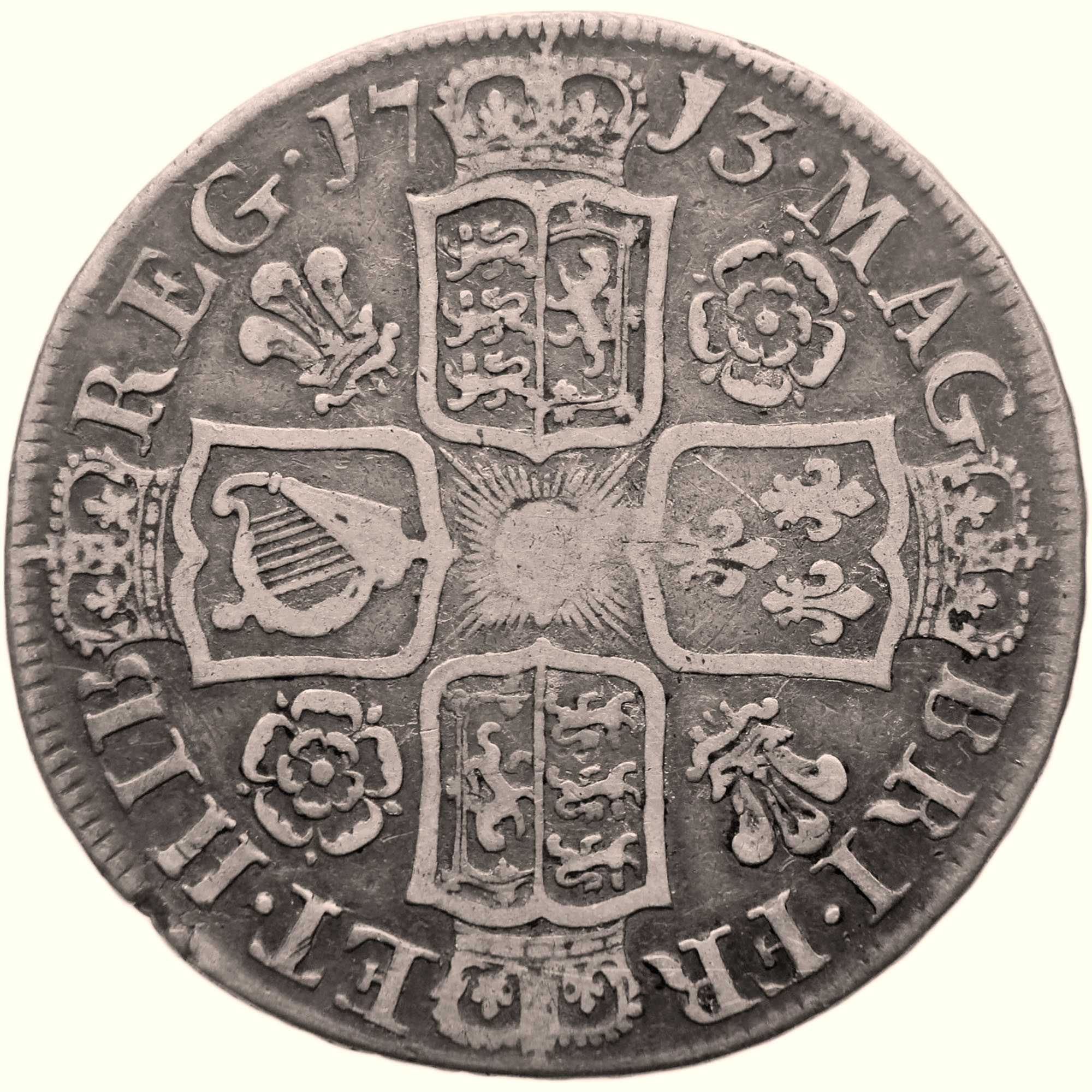 Reverse: Crowned cruciform shields around central Garter star, divided date above, legend around.