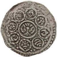 Reverse: Ornate lotus design within single circle surrounded by the Buddhist Eight Auspicious symbols (a white parasol, a conch shell, a treasure vase, a victory banner, a dharma wheel, a pair of golden fish, an endless knot, and a lotus flower) within the petals of an eight-petalled lotus.
