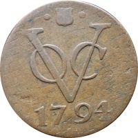 Obverse: VOC monogram, date 1794 below, mintmark ‘shield’ at top between dots