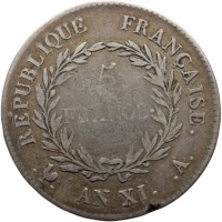 Reverse legend: RÉPUBLIQUE FRANÇAISE. 5 FRANCS... AN XI A