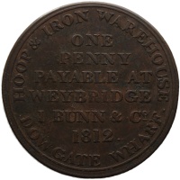 Reverse legend: ONE PENNY PAYABLE AT WAREHOUSE. I.BUNN & CO. 1812. HOOP & IRON WAREHOUSE, DOWGATE WHARF