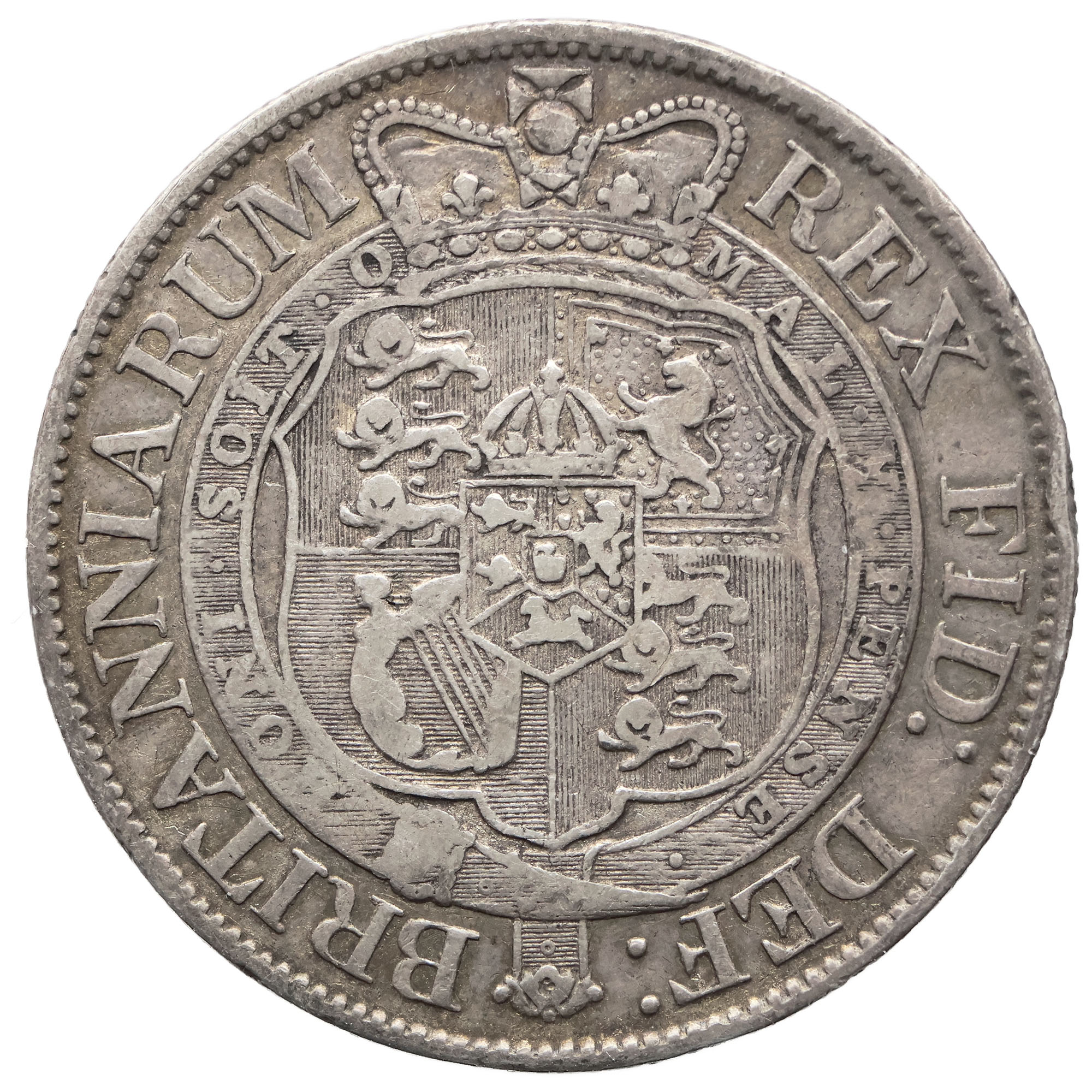 Reverse legend: BRITANNIARUM REX FID: DEF: HONI SOIT QUI MAL Y PENSE
