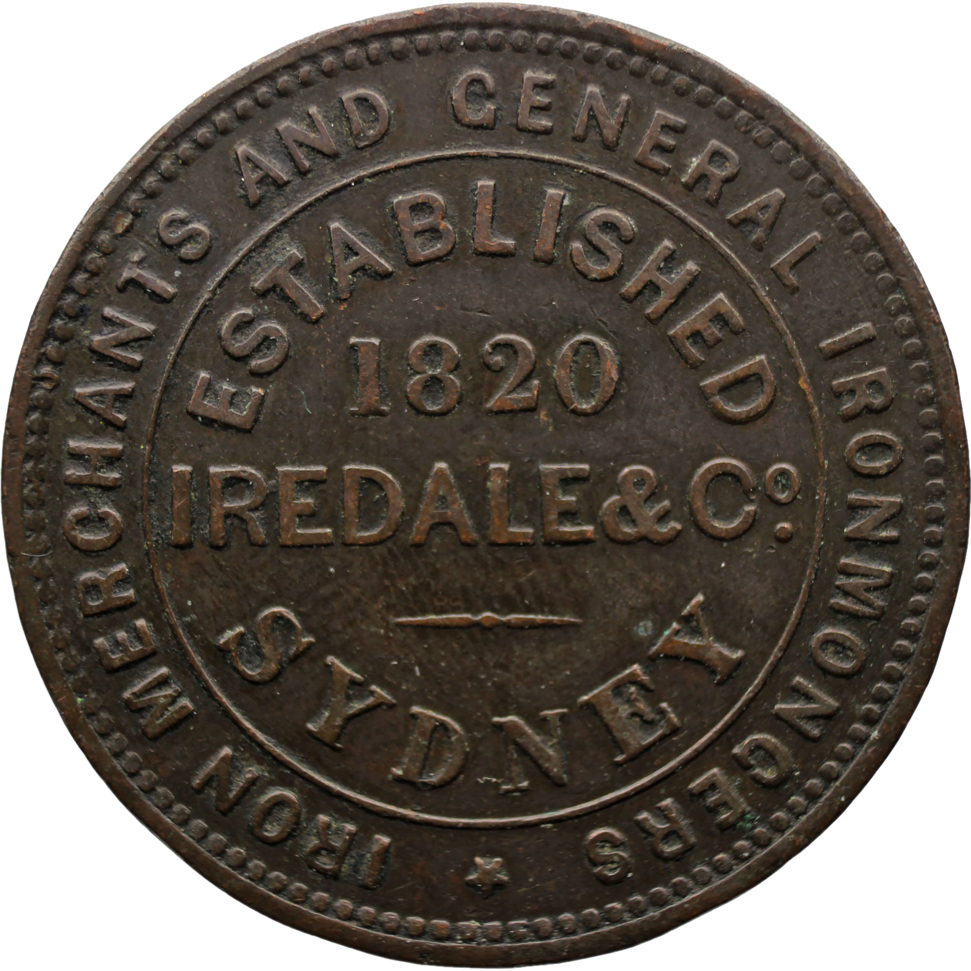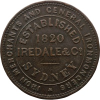 Reverse legend: IREDALE & Co. ESTABLISHED 1820 - SYDNEY - IRON MERCHANTS AND GENERAL IRON MONGERS