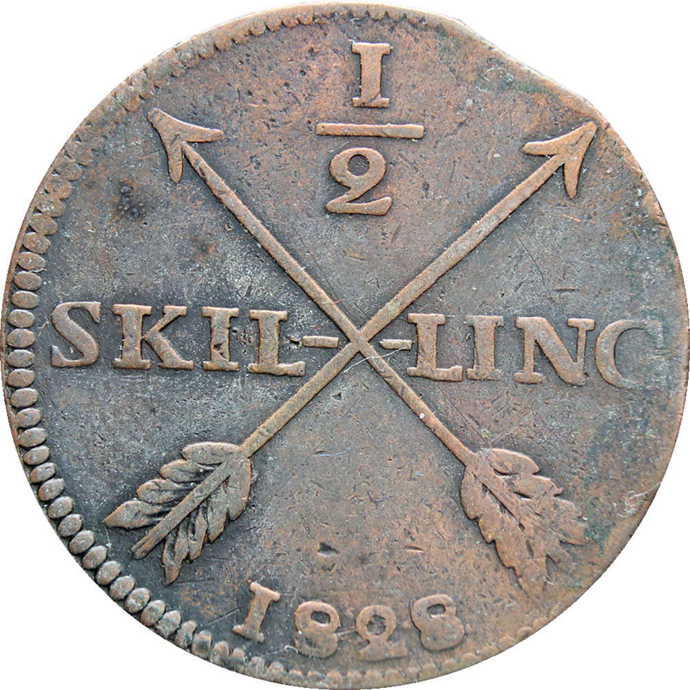 Reverse legend: “1/2 SKIL- -LING 1828”