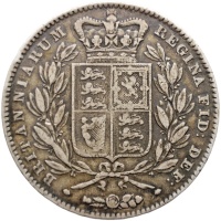 Obverse: Head of the Queen facing left wearing ribbon in hair; in small letters on neck truncation the artist's name W. WYON R.A.; around, VICTORIA DEI GRATIA; below, 1844