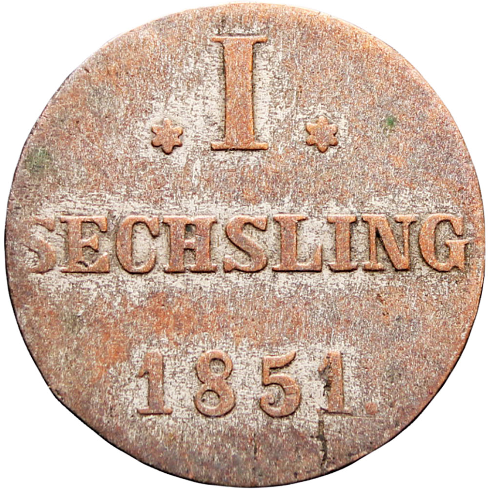 Reverse legend: “* I * SECHSLING 1851.”