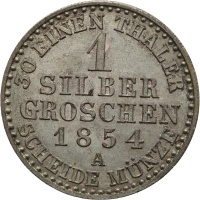 Reverse legend: 30 EINEN THALER 1 ꟾ SILBER ꟾ GROSCHEN ꟾ 1854 ꟾ A SCHEIDE MÜNZE