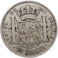 Reverse legend: REINA DE LAS ESPAÑAS 20 REALES