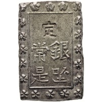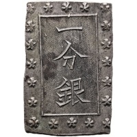 Obverse: Incuse stamp 定 (= Jo) over 4 kanji in rectangle surrounded by 20 sakuras (cherry blosoms).