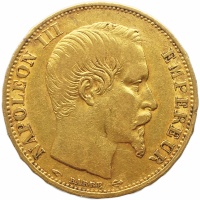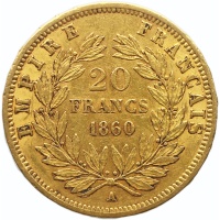 Reverse legend: EMPIRE FRANCAIS 20 FRANCS 1860 A