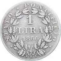 Reverse legend: “* STATO * PONTIFICIO * 1 LIRA 1866 R”