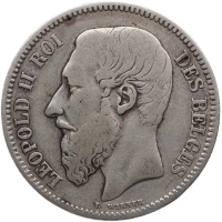 Obverse: Head of King Leopold II of Belgium with beard, facing left, surrounded by motto in French.