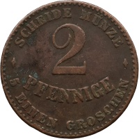 Reverse legend: SCHEIDE MÜNZE 2 PFENNIGE 5 EINEN GROSCHEN