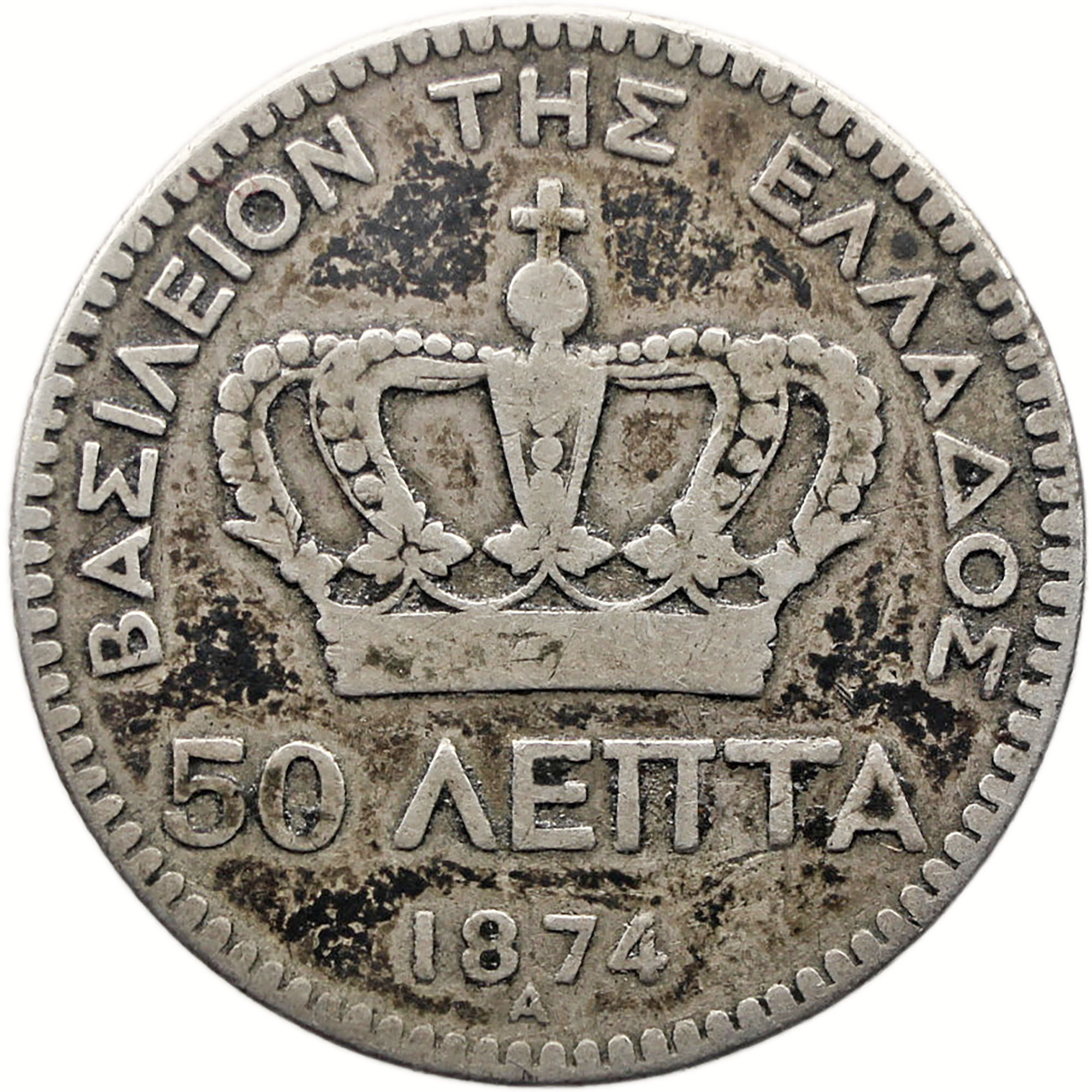 Reverse legend: ΒΑΣΙΛΕΙΟΝ ΤΗΣ ΕΛΛΑΔΟΣ 50 ΛΕΠΤΑ 1874 A