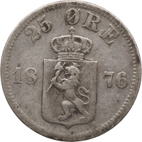 Reverse legend: 25 ØRE 1876