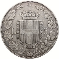 Reverse: Savoia crowned coat of arms decorated with the Collare dell'Annunziata divides value. All in encircled in a wreath made by a branch of laurel and one of oak. Up the crowned shield there is the Star of Italy. The Mintmark is below the wreath, on the right.