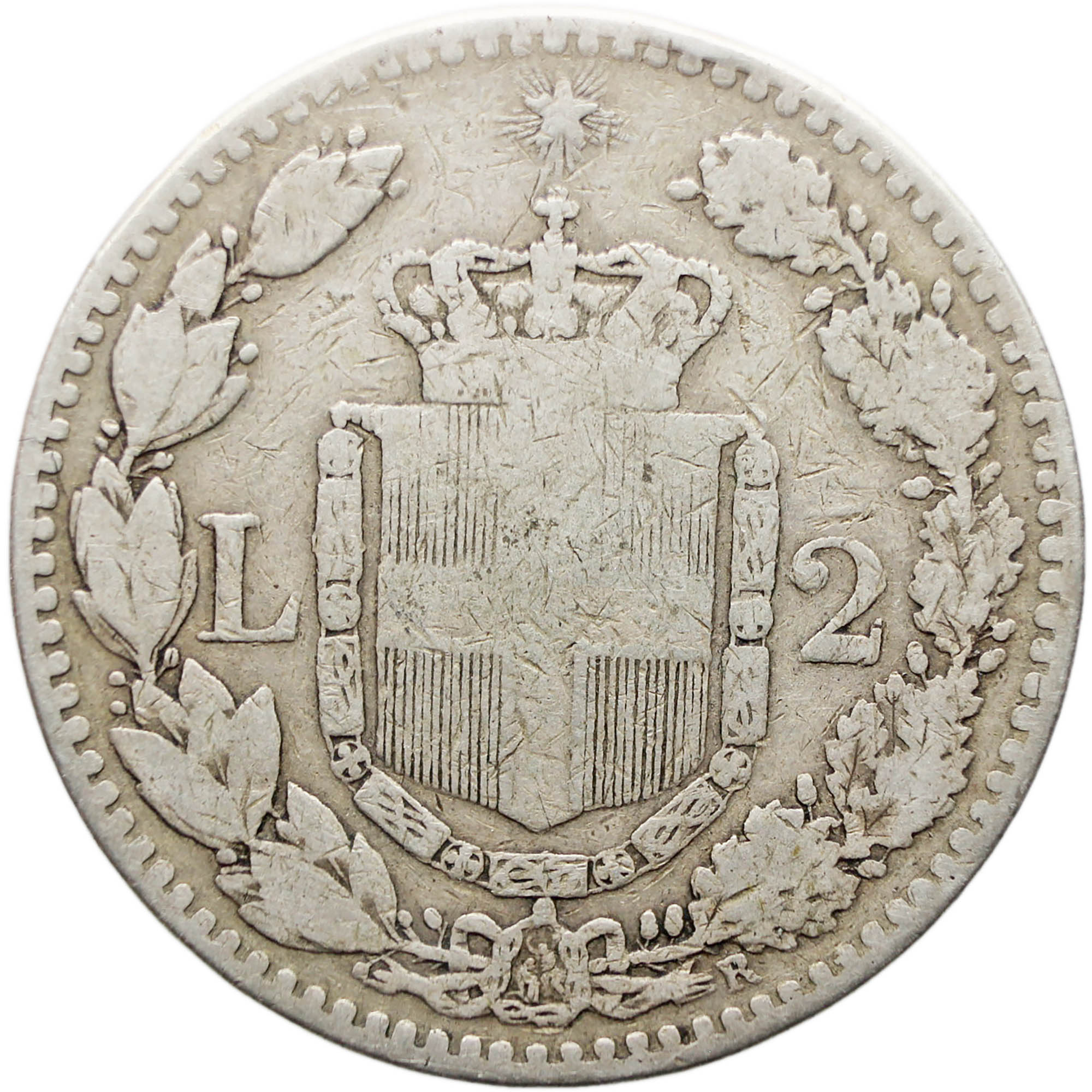 Reverse: Savoia crowned coat of arms decorated with the Collare dell'Annunziata divides value. All in encircled in a wreath made by a branch of laurel and one of oak. Up the crowned shield there is the Star of Italy. The Mintmark is below the wreath, on the right.