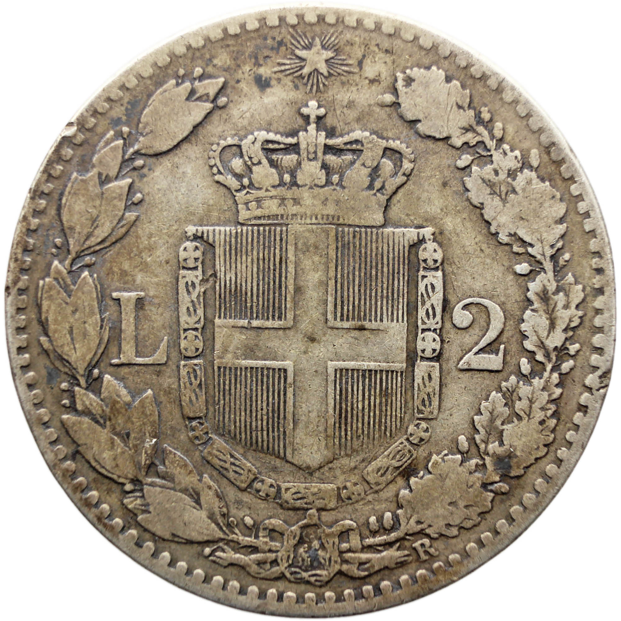 Reverse: Savoia crowned coat of arms decorated with the Collare dell'Annunziata divides value. All in encircled in a wreath made by a branch of laurel and one of oak. Up the crowned shield there is the Star of Italy. The Mintmark is below the wreath, on the right.