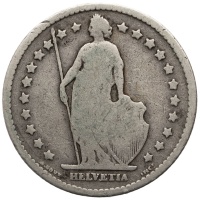 Obverse: Full-length figure of Helvetia, standing, facing left, wearing toga, holding a spear in right hand, and supporting shield with coat of arms of Switzerland