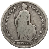 Obverse: Full-length figure of Helvetia, standing, facing left, wearing toga, holding a spear in right hand, and supporting shield with coat of arms of Switzerland