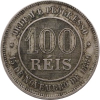 Reverse legend: ORDEM E PROGRESSO 100 RÉIS 15 DE NOVEMBRO DE 1889