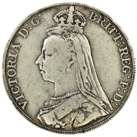 Obverse: Bust of the Queen facing left the small wearing imperial crown, long veil falling behind her head, pearl necklace and earring, Ribbon and Star of the Garter and the badge of the Imperial Order of India; in small raised letters on the bust truncation, the artist's initials J.E.B. (Joseph Edgar Boehm); around, VICTORIA D:G: BRITT: REG: F:D: