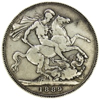 Reverse: St George on horseback advancing to right wearing a helmet and cape and holding a sword; below horse, fallen dragon with lance in its side; below exergue line at right the artist's initials B.P. (Benedetto Pistrucci); in exergue, 1889