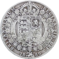 Reverse legend: “BRITANNIARUM REGINA FID DEF 1889 HONI SOIT QUI MAL Y PENSE”
