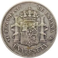 Reverse legend: REY CONSTL. DE ESPAÑA PG UNA PESETA. M.