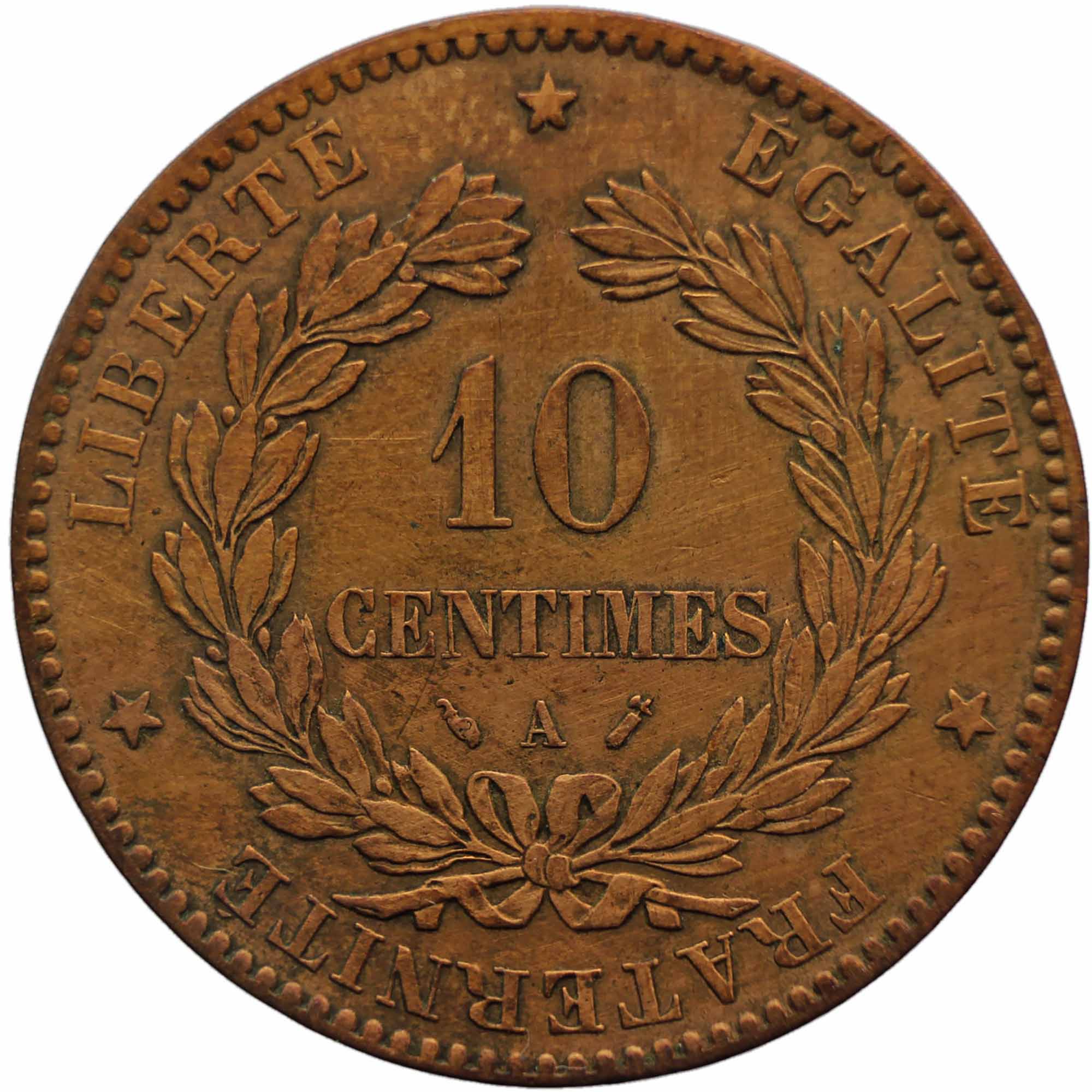Reverse legend: “LIBERTÉ * ÉGALITÉ * FRATERNITÉ * 10 CENTIMES A”
