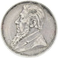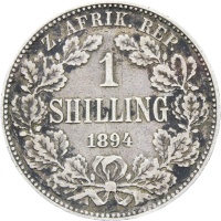 Engraver: Otto Schultz Reverse: Within a wreath of oak, 1 / SHILLING / 1894; around above, Z. AFRIK. REP. Reverse legend: “Z. AFRIK. REP. 1 SHILLING 1894” Engraver: Otto Schultz Edge: Reeded Denomination: one shilling Country: ZAR South Africa (Zuid Afrikaansche Republiek) Ruler: President Johannes Paulus Kruger Year: 1894 Mintage: 366.000 Metal: silver (0.9250) Weight approx.: 5.57 g. Diameter approx.: 23.7 mm
