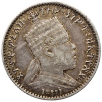Obverse: Right-facing bust of a bearded Menelik II wearing monarchical clothing and the Imperial Crown of Ethiopia.