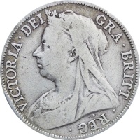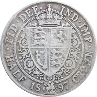 Reverse: crowned spade-shaped shield quartered with arms of England, Scotland and Ireland surrounded by the Collar of the Garter, around above, FID. DEF. IND. IMP., around below, HALF 1897 CROWN.