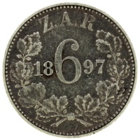 Obverse: Bust of President Johannes Paulus Kruger left Engraver: Otto Schultz Reverse: Within a wreath of oak, 6 / Z.A.R. / 1897 Reverse legend: “6 / Z.A.R. / 1897” Engraver: Otto Schultz Edge: Reeded Denomination: six pence Country: ZAR South Africa (Zuid Afrikaansche Republiek) Ruler: President Johannes Paulus Kruger Year: 1897 Mintage: 220.000 Metal: silver (0.9250) Weight approx.: 2.82 g. Diameter approx.: 19.3 mm Authenticity unconditionally guaranteed !
