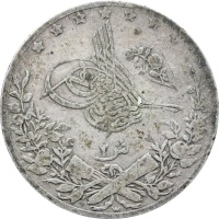 Obverse: 7 stars at the top, flower to right of tughra, denomination below, wreath sprigs from quivers