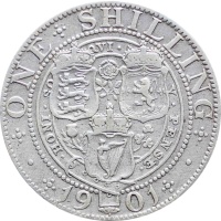 Reverse legend: “ONE SCHILLING • 1901 ••HONI•SO QVI• V• PENSE•”