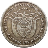 Reverse legend: VEINTICINCO CENTESIMOS DE BALBOA ******* PRO MUNDI BENEFICIO G.12.500 LEY 0.900