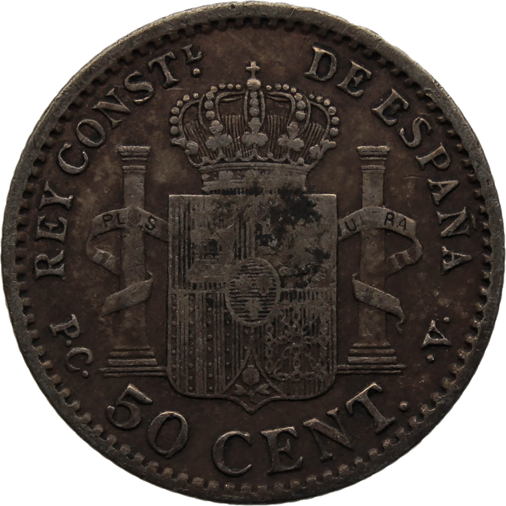 Reverse legend: REY CONSTL. DE ESPAÑA SM 50 CENT. V