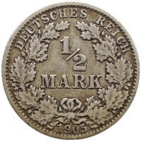Reverse legend: DEUTSCHES REICH 1/2 MARK 1905