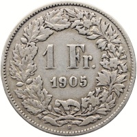 Obverse: Full-length figure of Helvetia, standing, facing left, wearing toga, holding a spear in right hand, and supporting shield with coat of arms of Switzerland