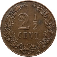 Reverse: Denomination “2½ CENT” surrounded by a wreath of olive and oak branches tied with a ribbon